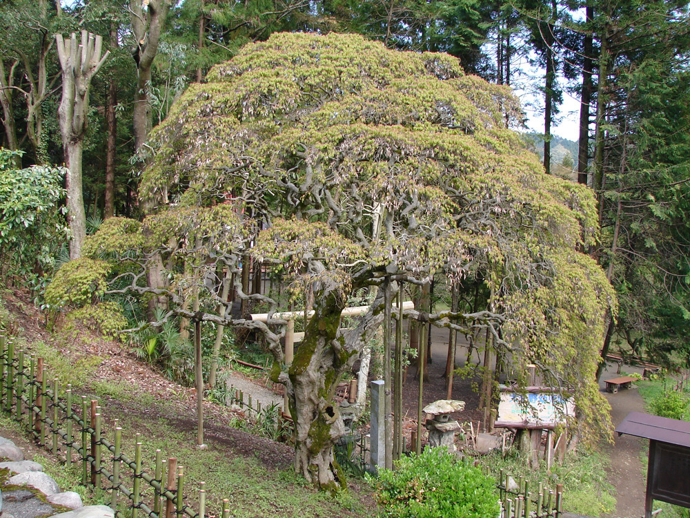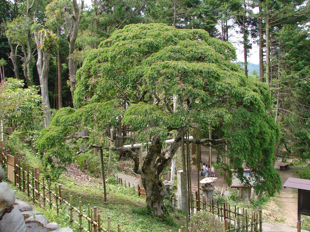 樹齢700年以上といわれ、アカシデ(ソロノキ)の変種で、枝がしだれるアカシデはこの木がただ1本であるとされています。この木の姿は根元から屈曲し、大小の枝は螺旋状によじれながら垂れていて、全体の形は盆栽のように優美な樹形をしています。(樹高約4.5m)