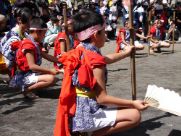 「奴の舞」は15人程の小学生達が白扇と木刀を持ち、お囃子にのって舞ながら、大太鼓を中心に円陣をつくり、一人ずつ「えっへん」ではじまる台詞を述べていきます。(台詞を下段に記載)