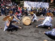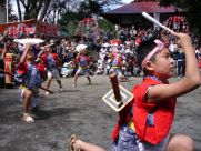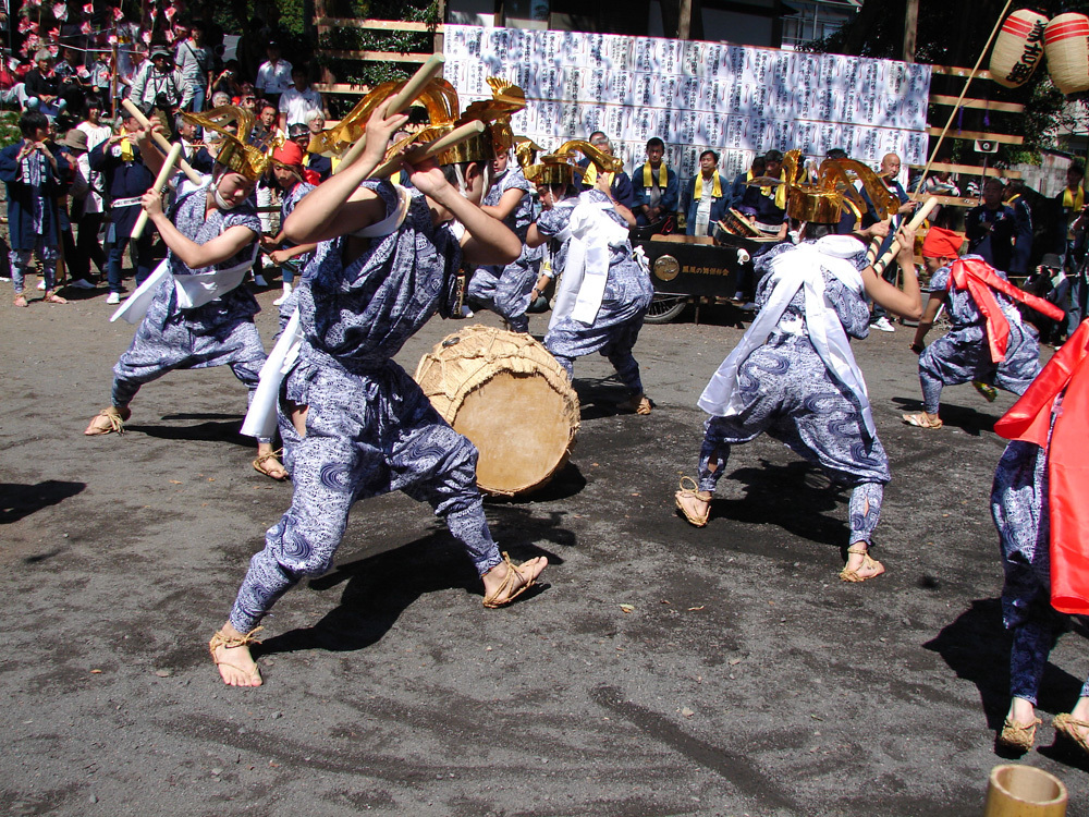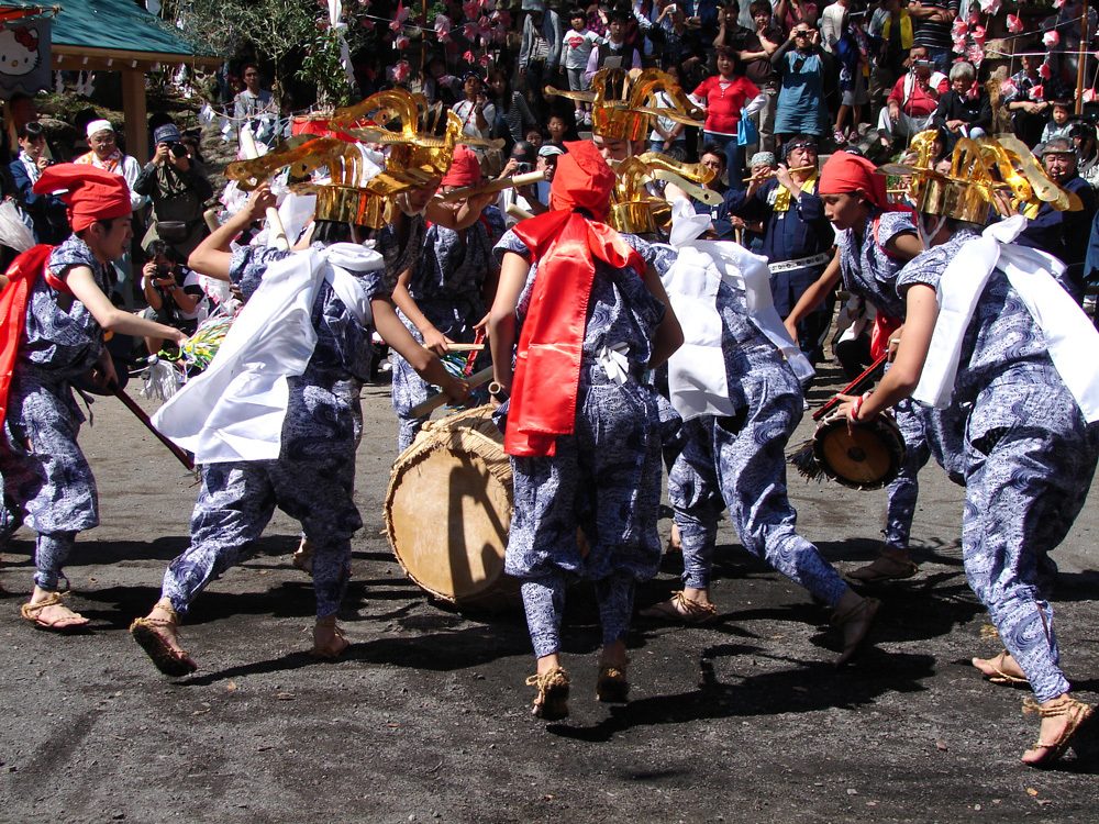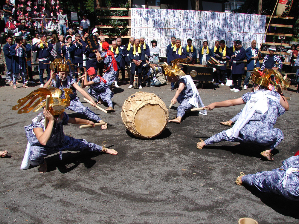 「鳳凰の舞」は冠を被った鳳凰役5人と赤い頭巾を被った5人の総勢10人が、軍配を持った先導の「そーりゃ持ってこい」掛け声に合わせ、大太鼓の周りを豪快かつ雅やかに、大太鼓を叩きながら舞います。(最も難しい所作は、腰をぐっと落として前に出した足と手、後に引いた足と、肩の高さを大太鼓の高さ位にして、撥を立てた姿勢がほぼ一直線になるようにするところだそうです)