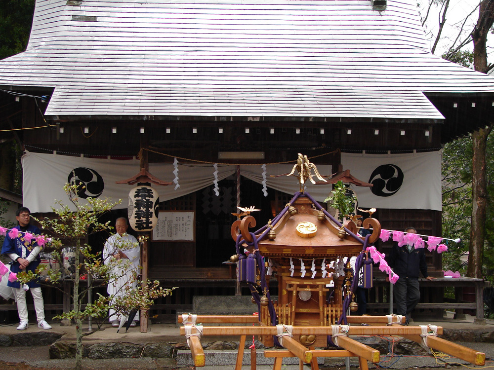 御由緒に「建武2年3月26日に出雲路(京都市上京区幸神町)幸神(さいのかみ)をこの地にご勧請申しあげた・・・といはれる」ことから例祭日は3月26日。 神輿や山車の巡行は土曜・日曜日が行われます。地区内を巡行する山車では、2つの小太鼓の軽妙な掛合いとテンポの良さが特徴的な重松流祭囃子が奏でられます。