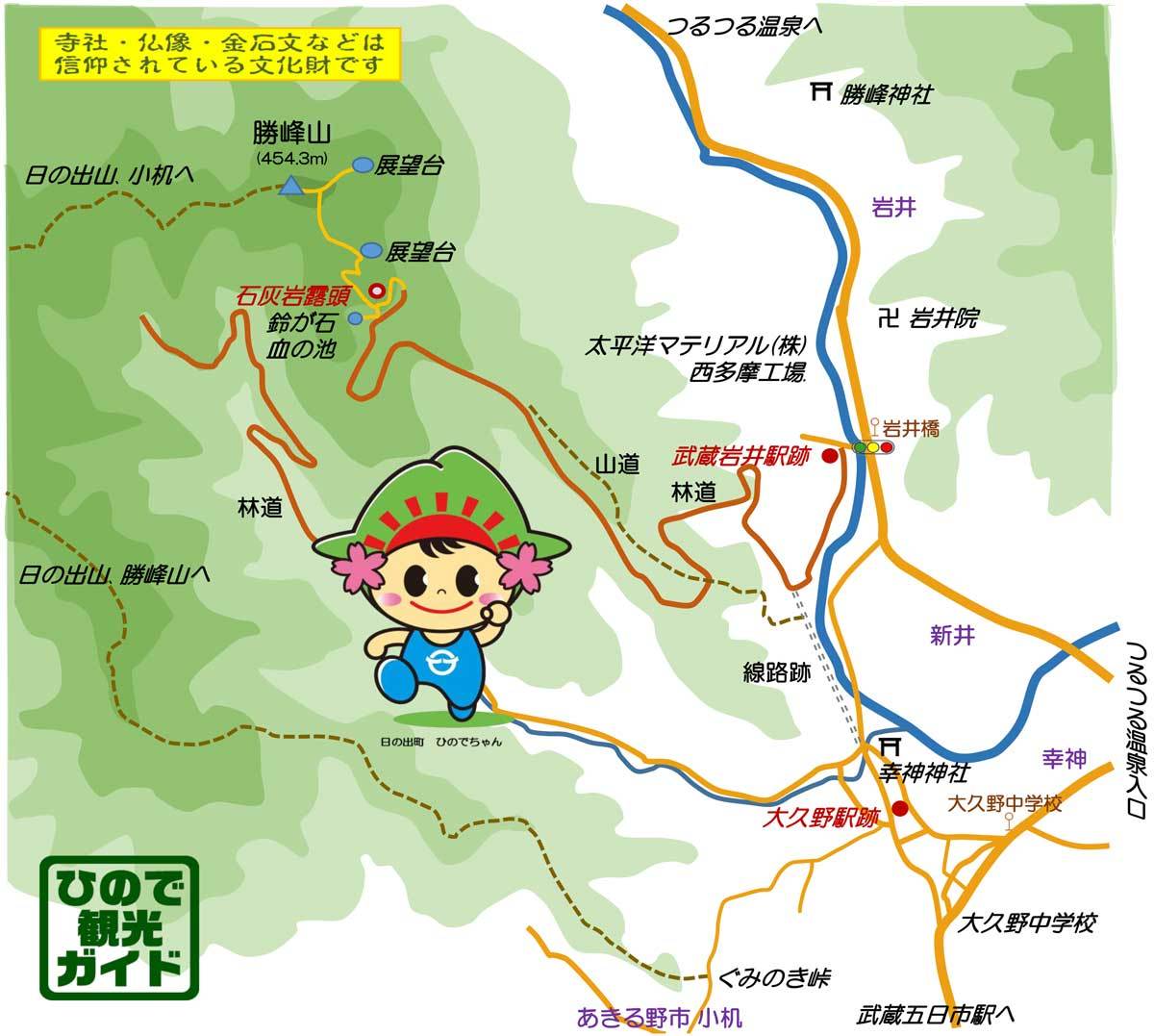 ・武蔵五日市駅からつるつる温泉行きバスで、岩井橋バス停で下車して、岩井橋を渡り川沿えの林道から登れます。