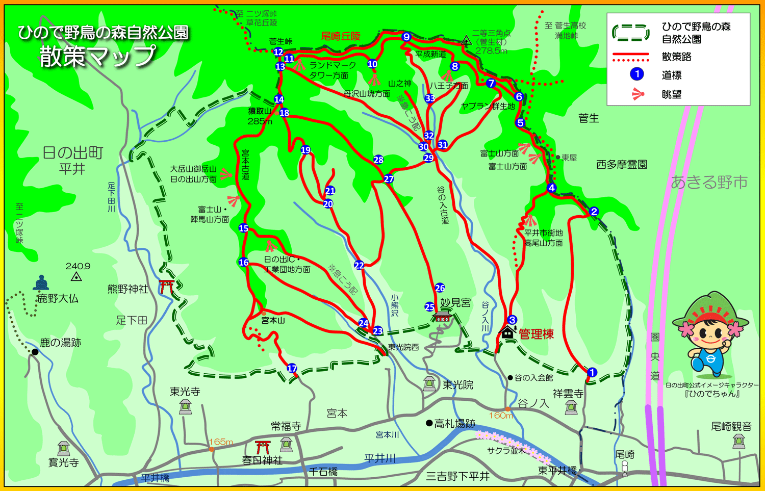 日の出町の東部平井・川北地区にある、約100㏊の里山です。町が所有し、未来につながる豊かな里山として保全と活用の公園基本構想をまとめ、具体策を策定し活用を目指しています。散策路は整備され里山歩きには最適で、季節ごとの草花、天気の良い日には日の出山・奥多摩の山々、横浜方面の展望も楽しめます。