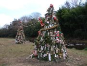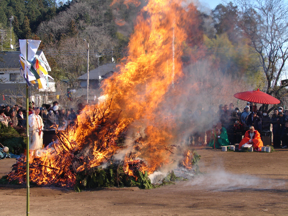 芯木の周りに青竹を円錐状に立てかけ、萱や杉の葉などをかぶせ、周りに正月飾りや古いダルマなどで飾り付け焚き上げられます。どんど焼きの火で繭玉団子を焼いて食べると1年中病気をしない、風邪をひかない、無病息災などと言われており、書初めを燃やして高く舞い上がると字が上手になると言われています。塞の神は1月7日頃から飾られます。元々は小正月の前日の早朝に行われていました。