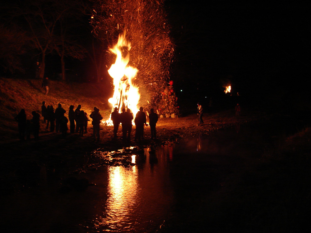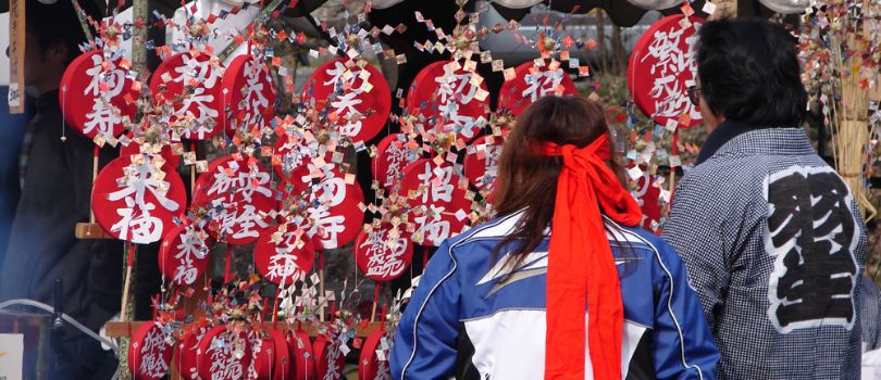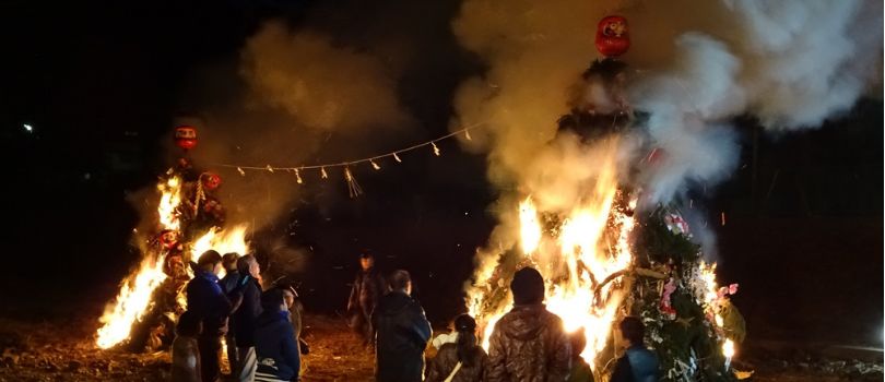 芯木の周りに青竹を円錐状に立てかけ、萱や杉の葉などをかぶせ、周りに正月飾りや古いダルマなどで飾り付け焚き上げられます。どんど焼きの火で繭玉団子を焼いて食べると1年中病気をしない、風邪をひかない、無病息災などと言われており、書初めを燃やして高く舞い上がると字が上手になると言われています。塞の神は1月7日頃から飾られます。元々は小正月の前日の早朝に行われていました。